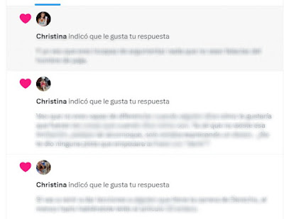 Esto es algo ya rutinario, pero lo que no lo era tanto, que me hizo gracia y da pie a esta entrada es que no había tanta coordinación. Ayer, cuando me conecté, vi que había tres likes a tres mensajes míos, los tres firmados por "Christina", pero cada uno desde una cuenta diferente, y poco después con 4 firmados por "Cindy".